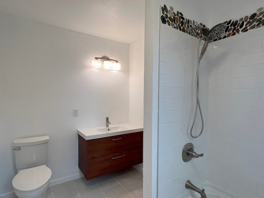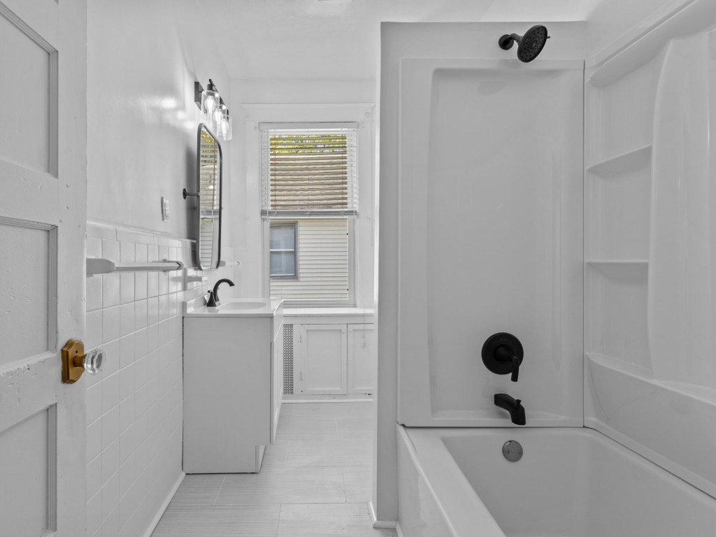 Solutions: Make both bedrooms a reasonable size with a modern bathroom to fit them both. Add pocket doors to use the least amount of space and add some customized features like a floating vanity and tile tub and floor.