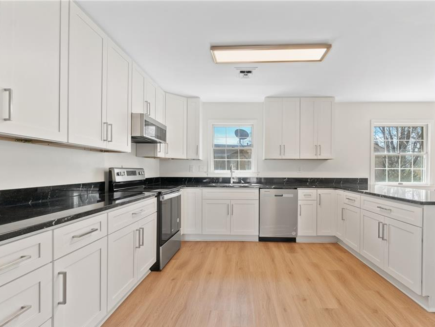 Solutions: Custom cabinetry & countertops, open kitchen, modern appliances, LVP flooring, roofing, change garage to addition bedroom, and reconfigure 1st floor bath to work as a master bath.